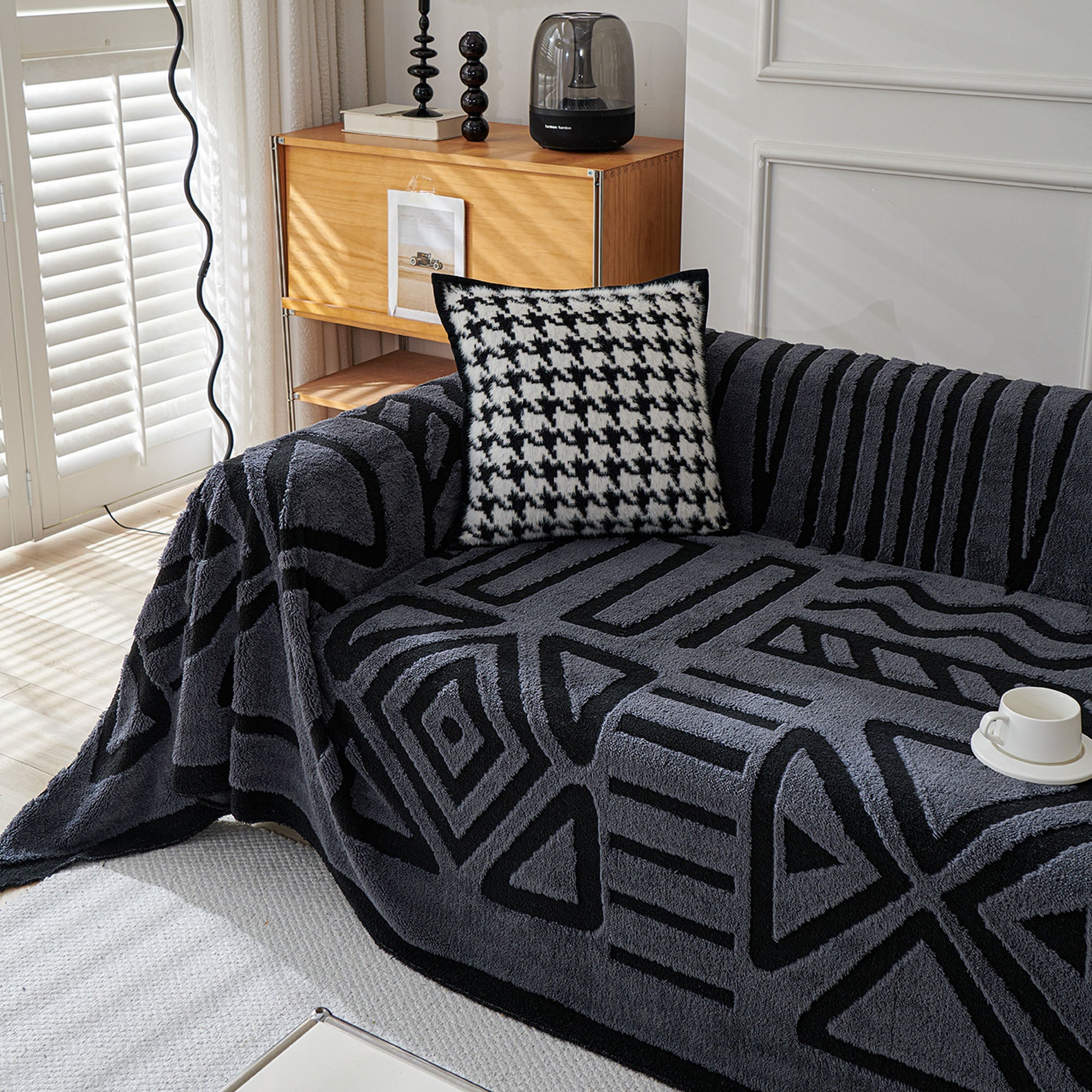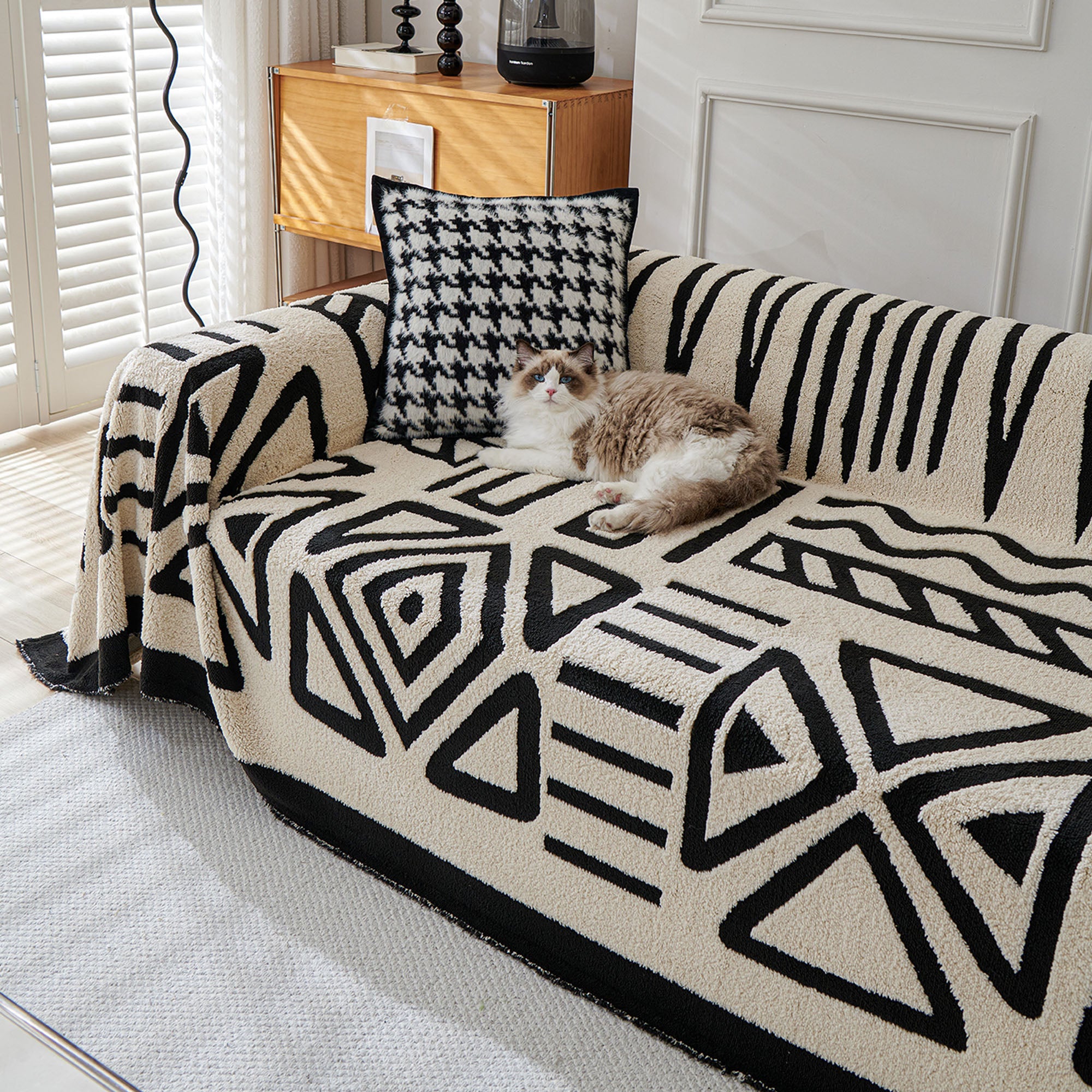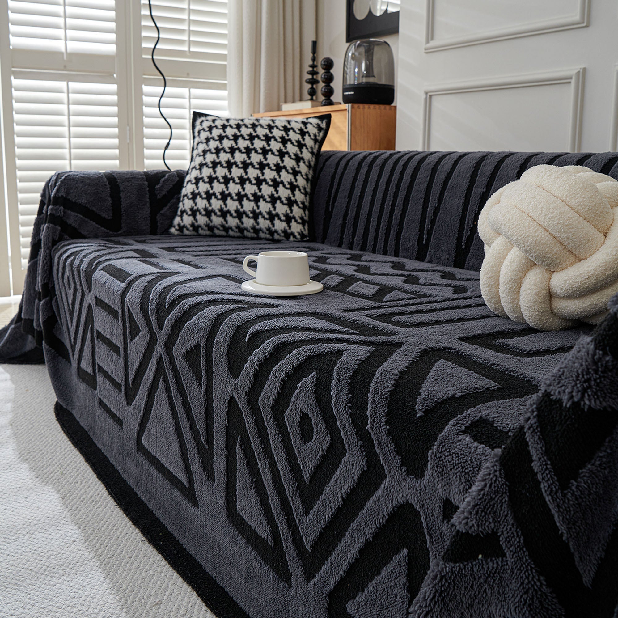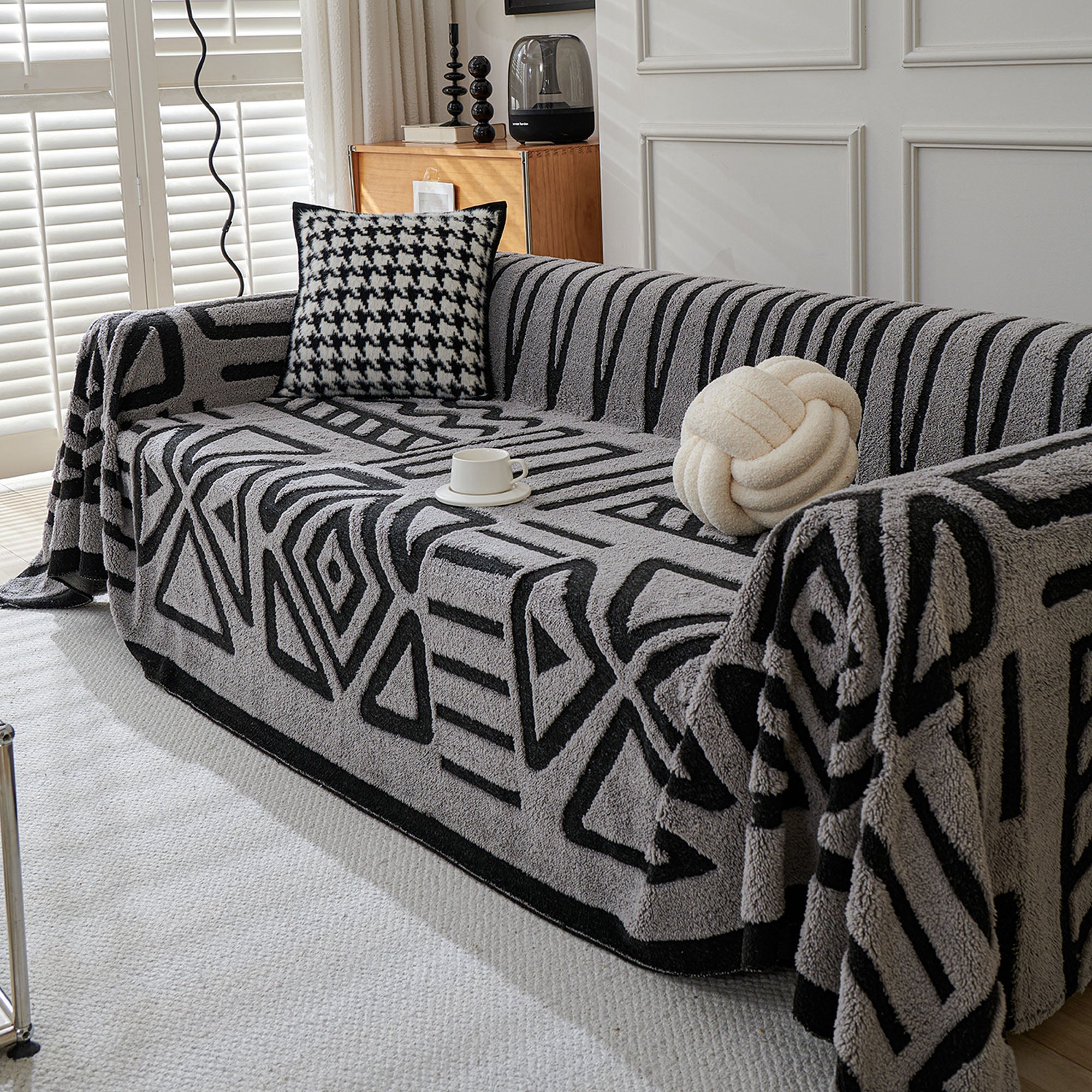 Transform your living space with our luxurious plush sofa cover, featuring bold geometric patterns for a touch of modern sophistication. This versatile piece combines style and function, providing a cozy haven for both you and your furry companions while protecting your furniture.