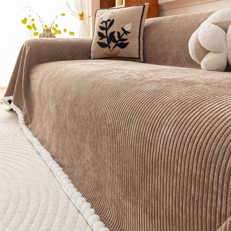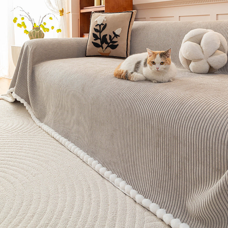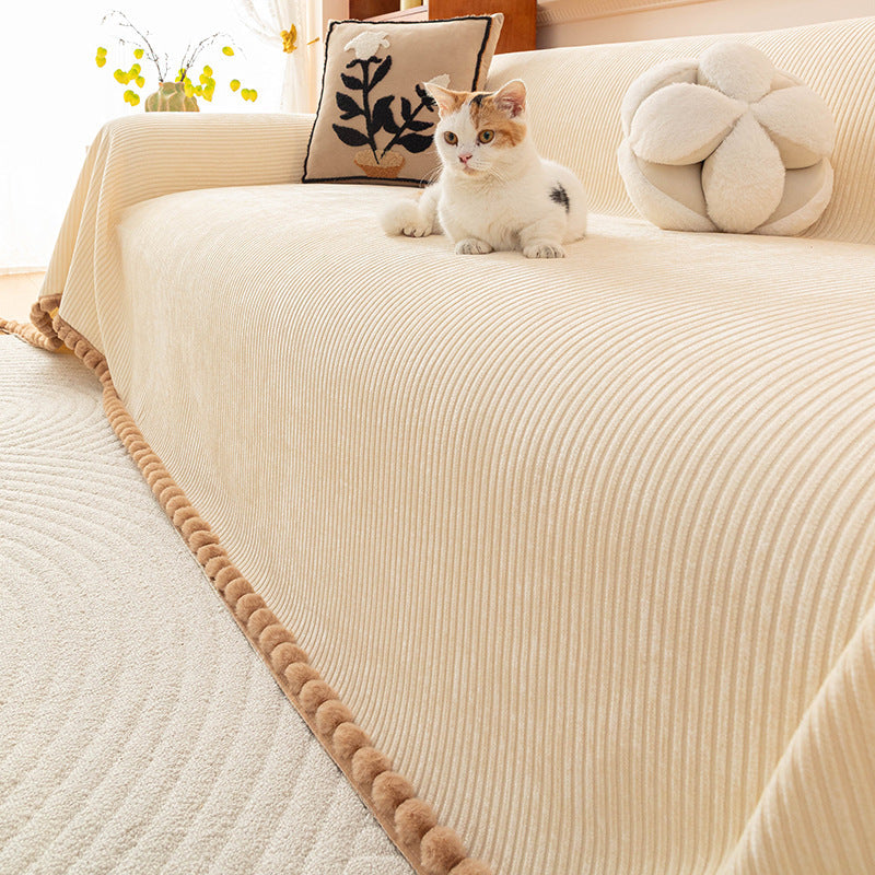 Bring soft texture and refined elegance to your home with the Luxe Ribbed Pom Trim Chenille Sofa Cover. Featuring a delicate ribbed surface and pom trim edging, this cover adds a warm, elevated touch to your sofa while helping protect against daily wear, pet hair, and scratches. Soft, skin-friendly, and durable for all-season use, it works beautifully as both a decorative throw and a practical sofa protector.
