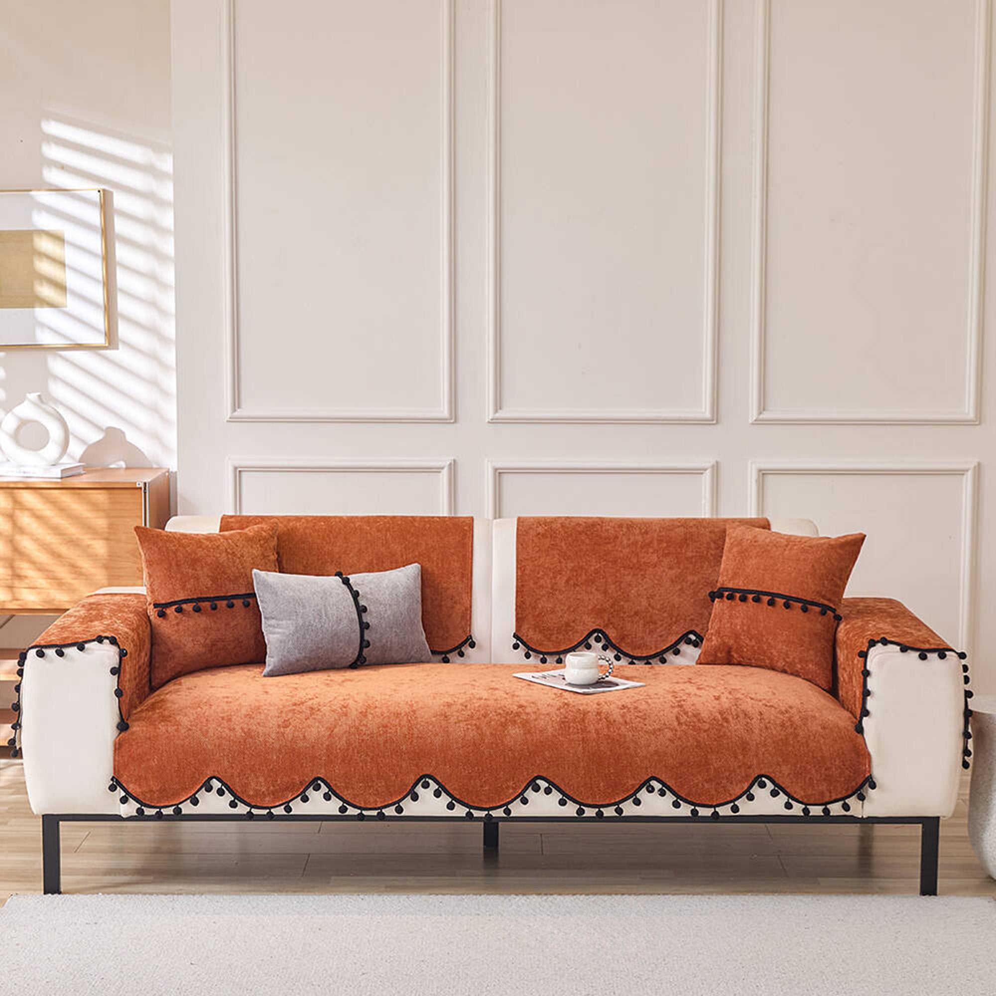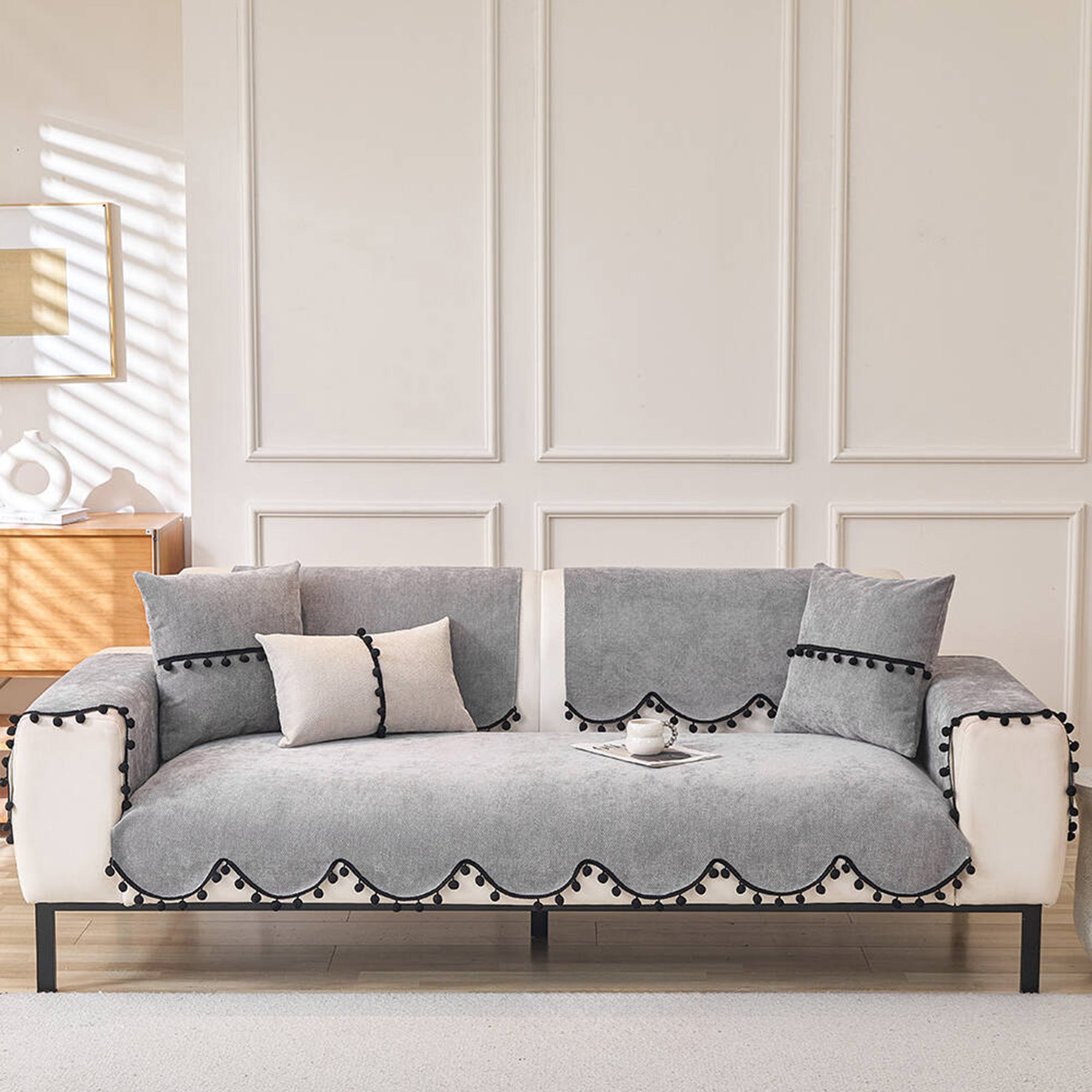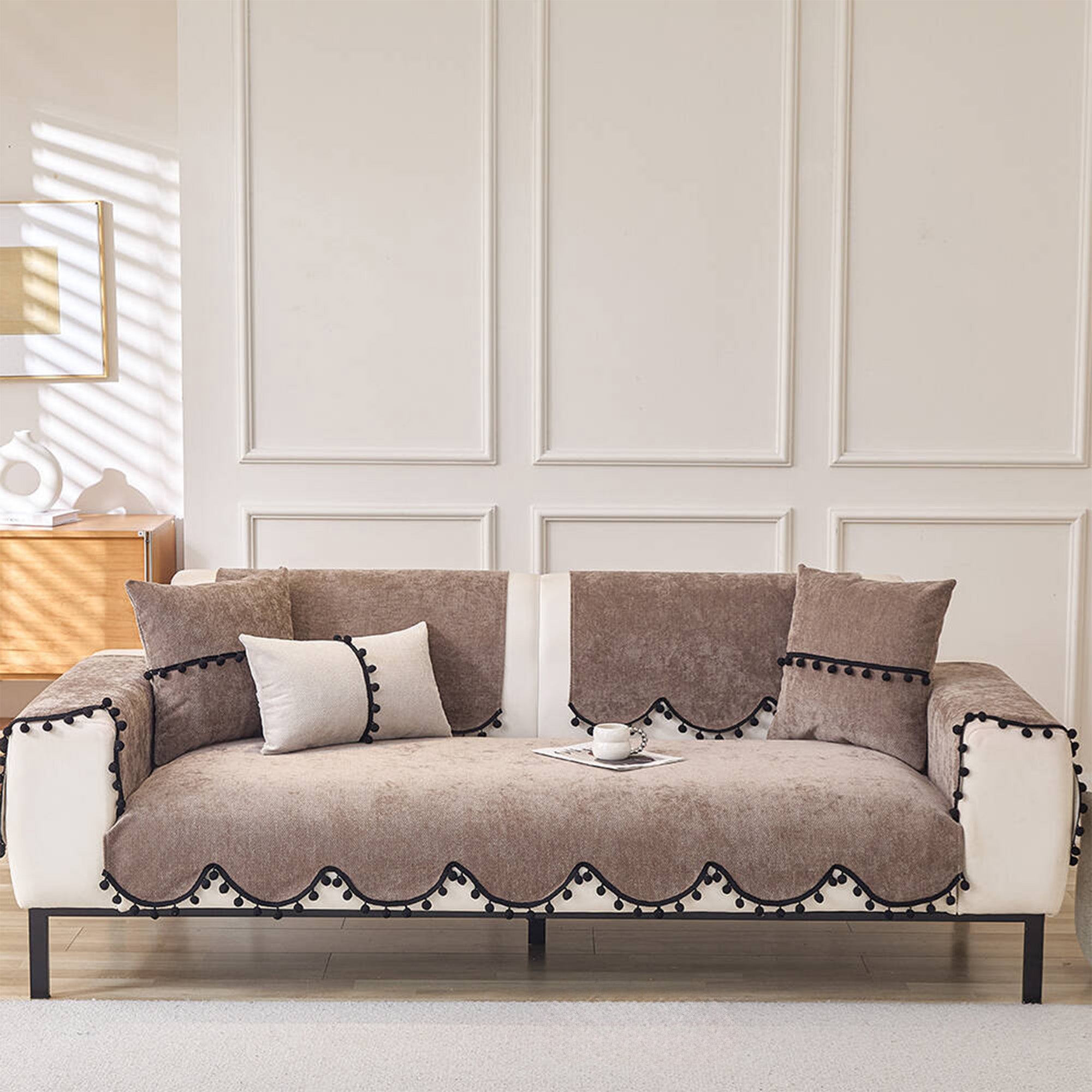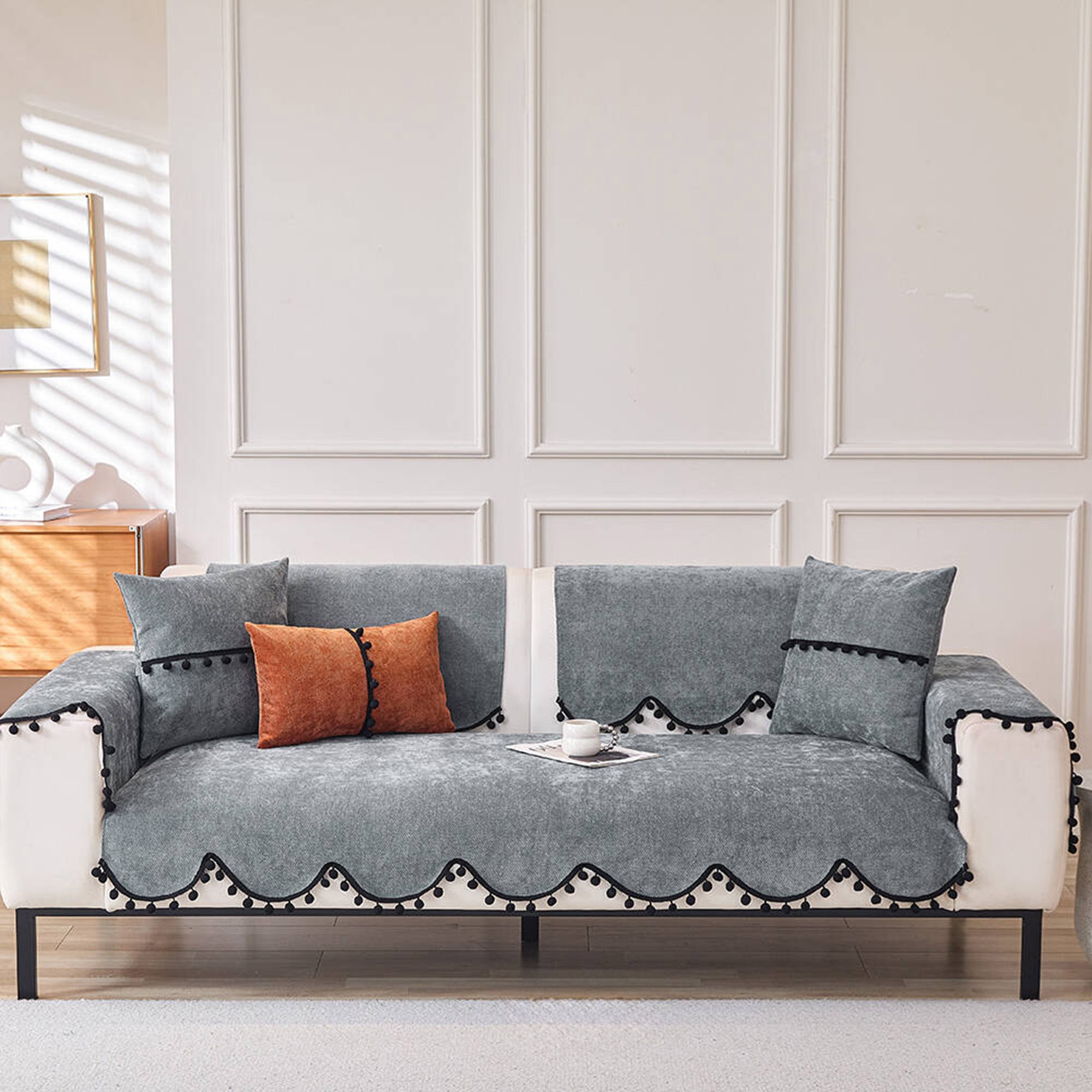 Elevate your sofa with this fashion-forward chenille cover, finished with a chic scalloped hem and black pom-pom trim. The dense, short-pile chenille feels plush yet wears hard, while a non-slip backing helps keep every panel neatly in place. Designed for year-round use, it shields against pet scratches, fur, spills, and everyday wear—delivering a clean, minimal upgrade in minutes.