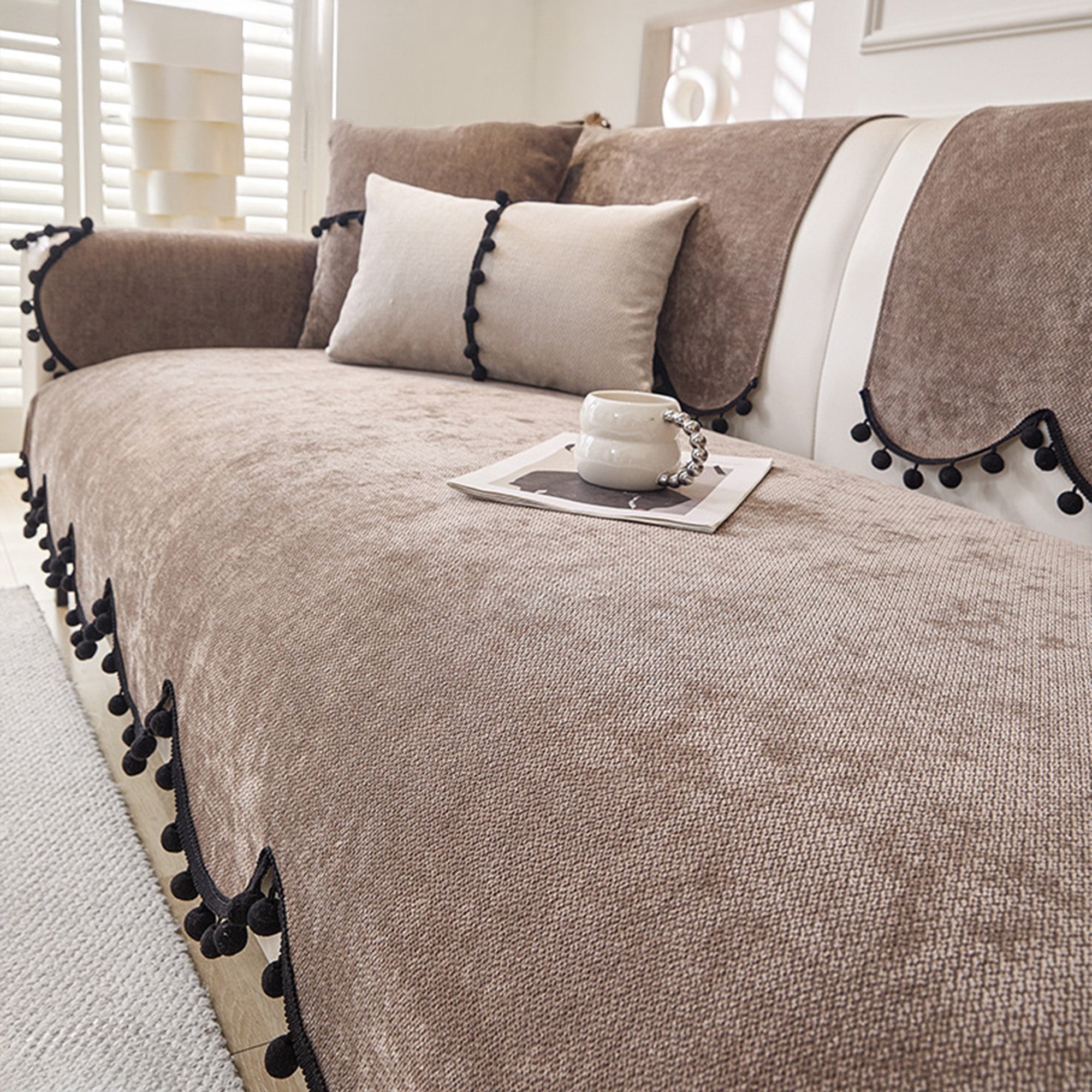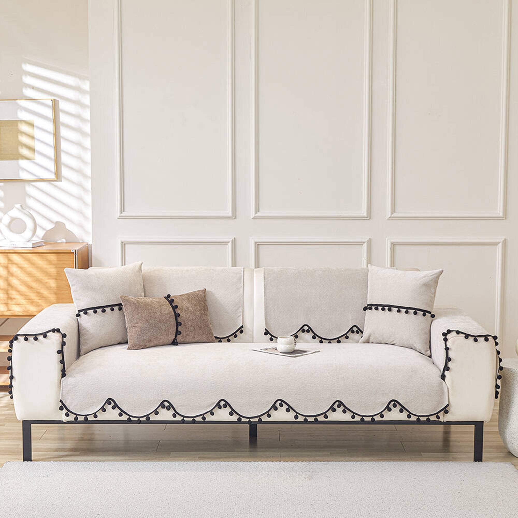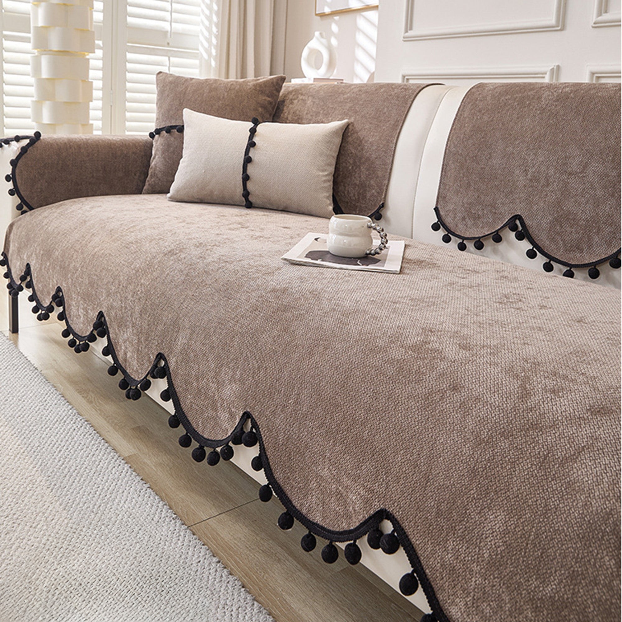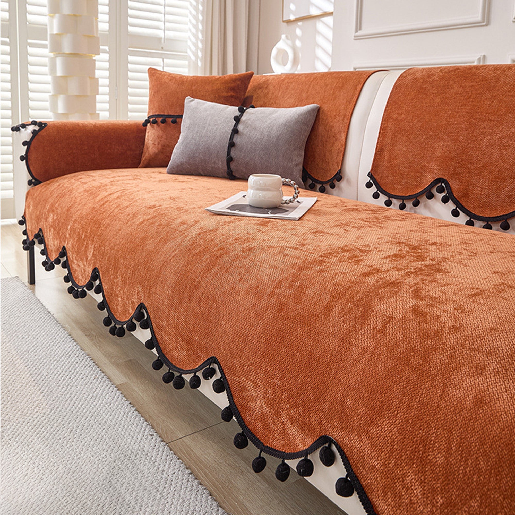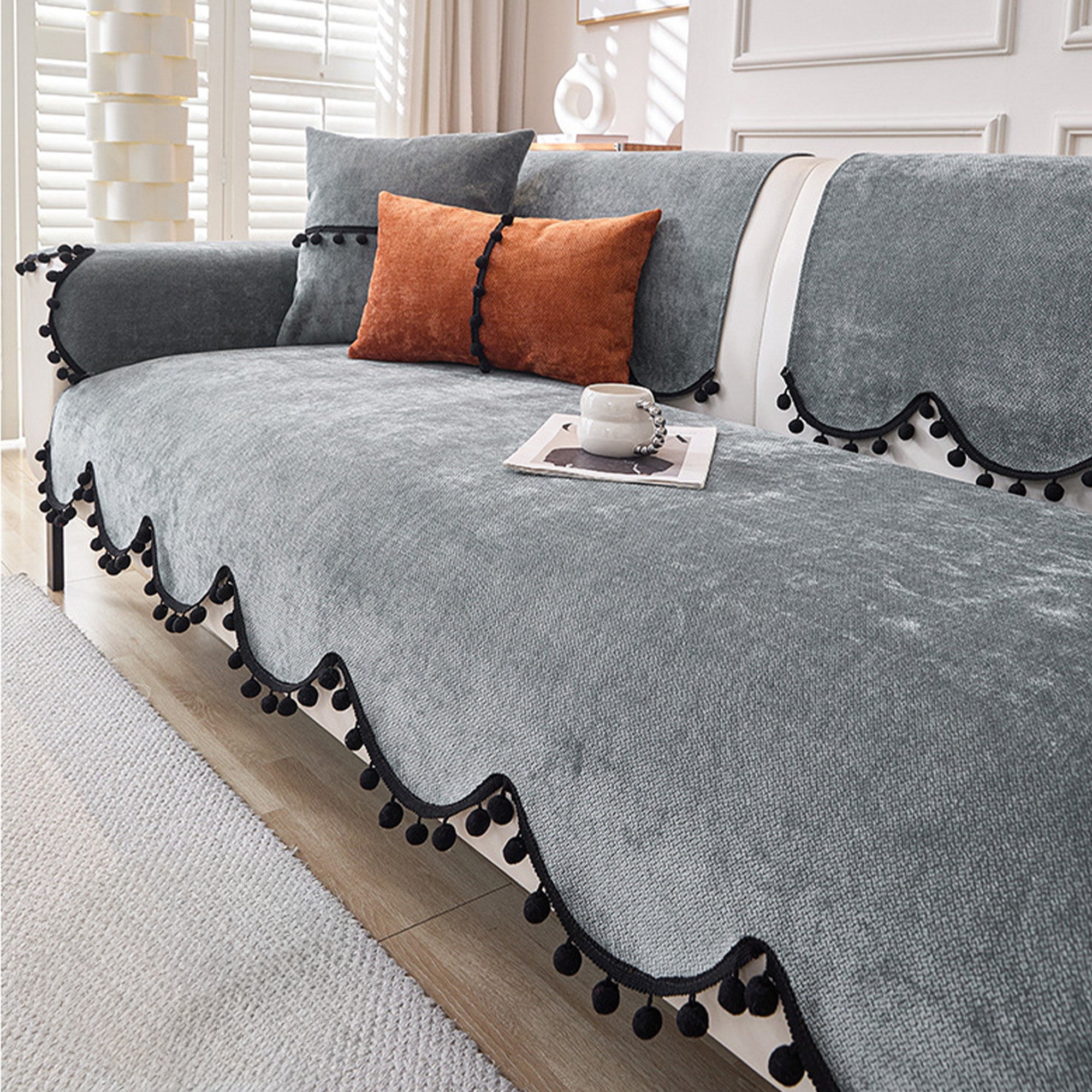 Elevate your sofa with this fashion-forward chenille cover, finished with a chic scalloped hem and black pom-pom trim. The dense, short-pile chenille feels plush yet wears hard, while a non-slip backing helps keep every panel neatly in place. Designed for year-round use, it shields against pet scratches, fur, spills, and everyday wear—delivering a clean, minimal upgrade in minutes.