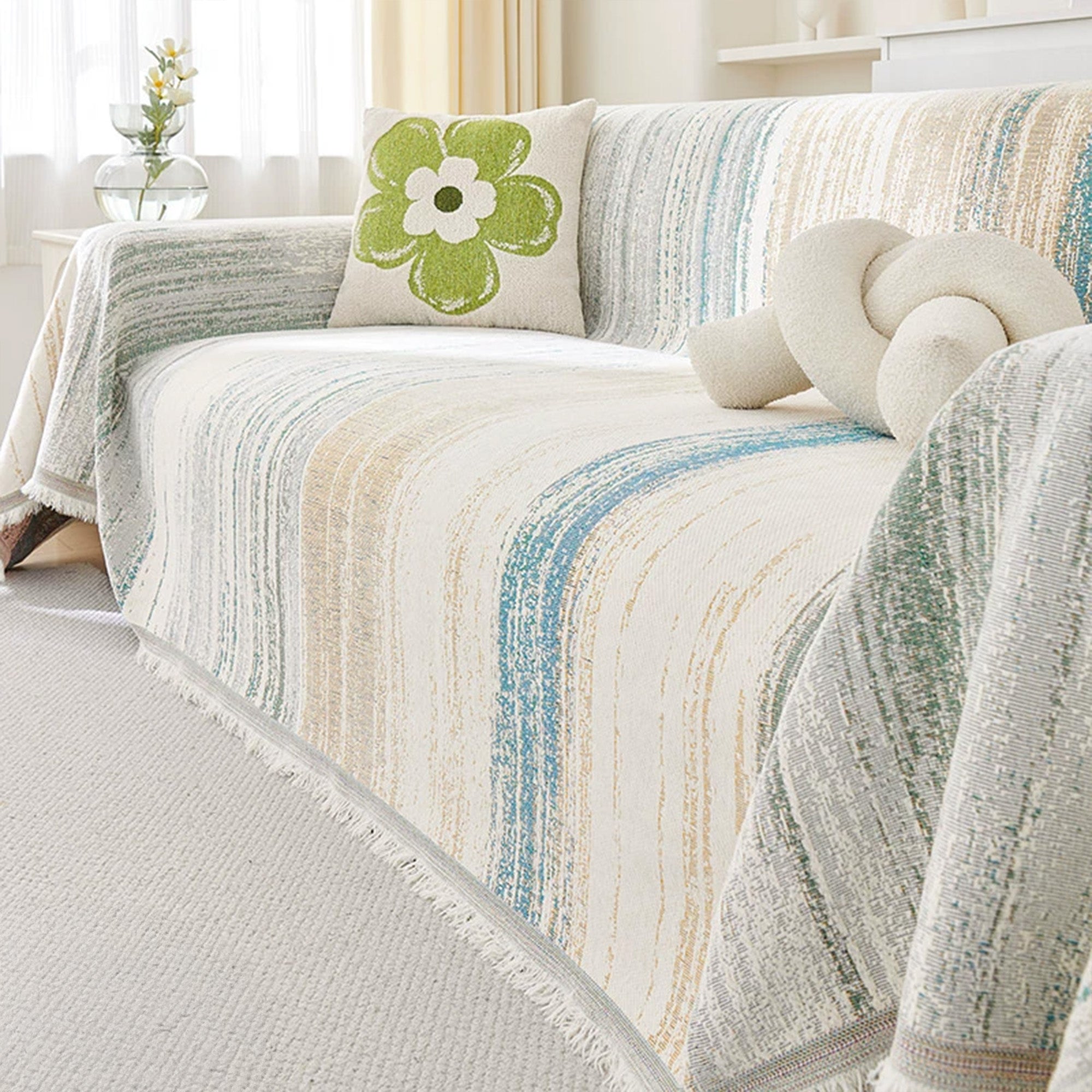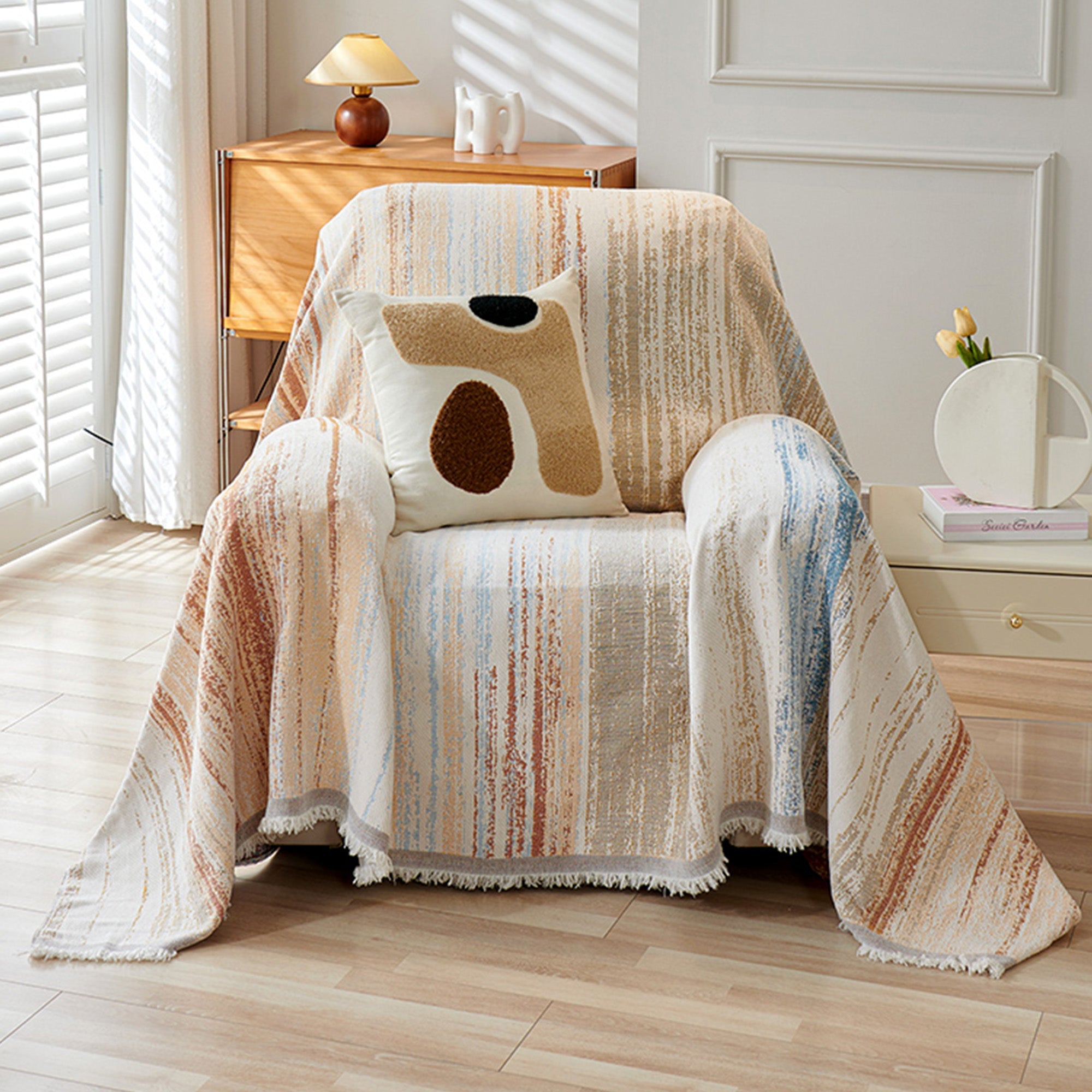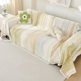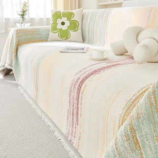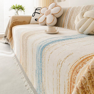 Inspired by the gentle movement of waves and watercolor brushstrokes, the Ripple Soft Chenille Sofa Cover brings a serene and effortless beauty to your living space. Crafted from ultra-soft chenille yarns, it features a flowing stripe pattern that blends creamy neutrals with soft pops of color — like nature painted in motion. Its delicate fringe adds a relaxed, cozy finish that complements minimalist, Nordic, or Japandi interiors.