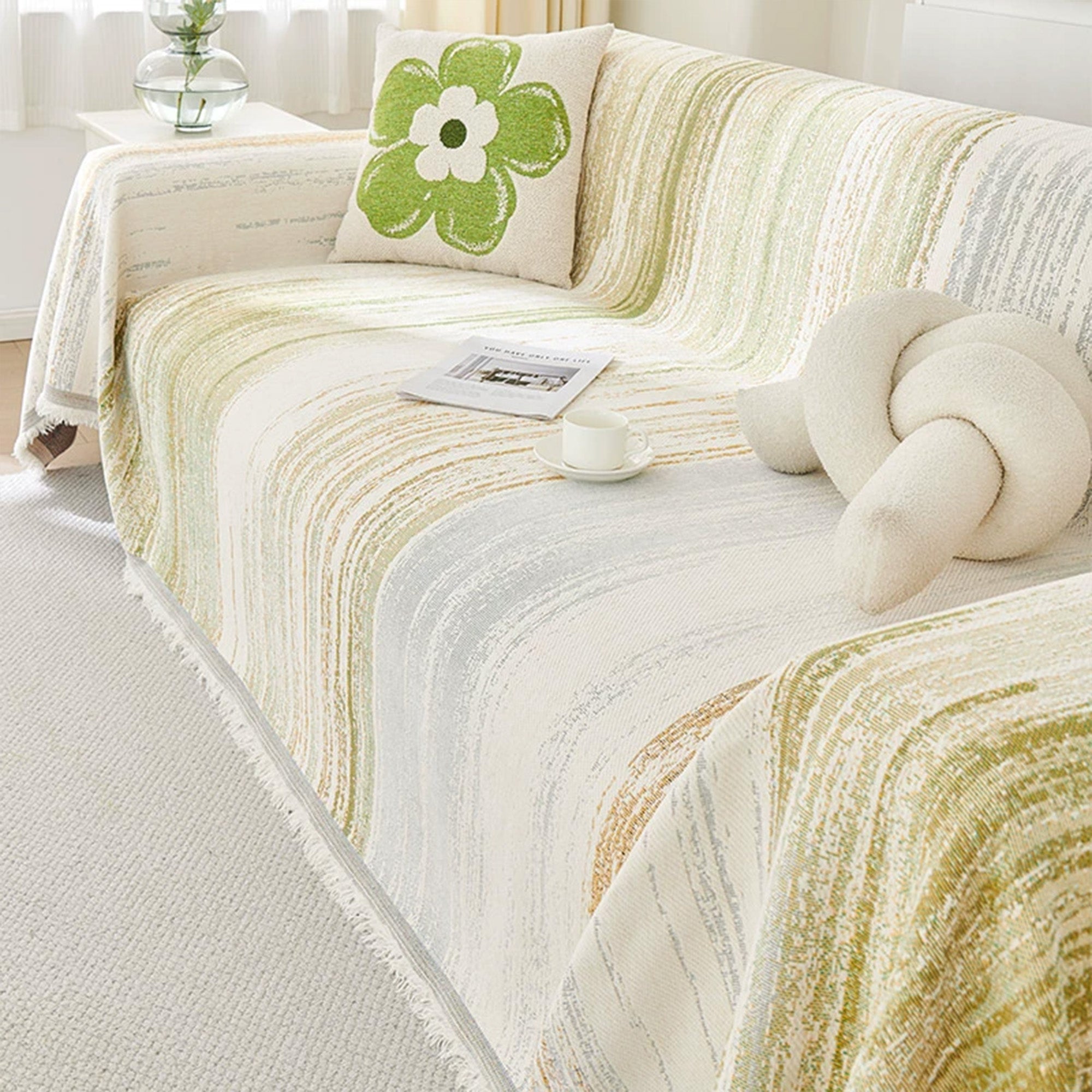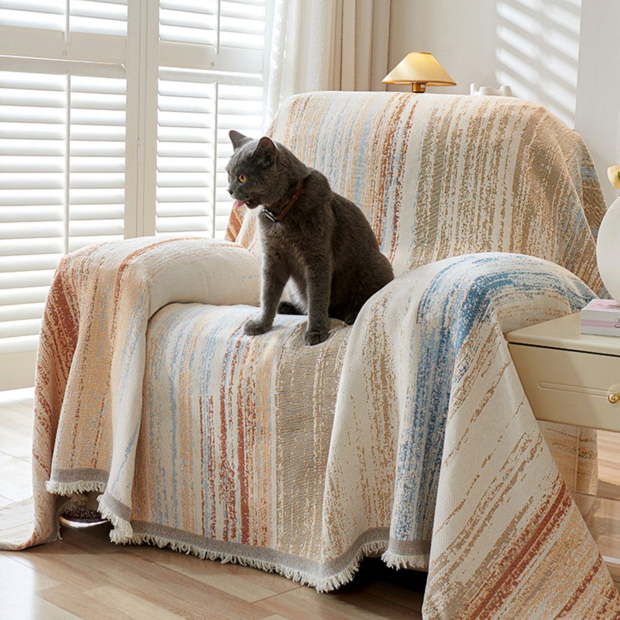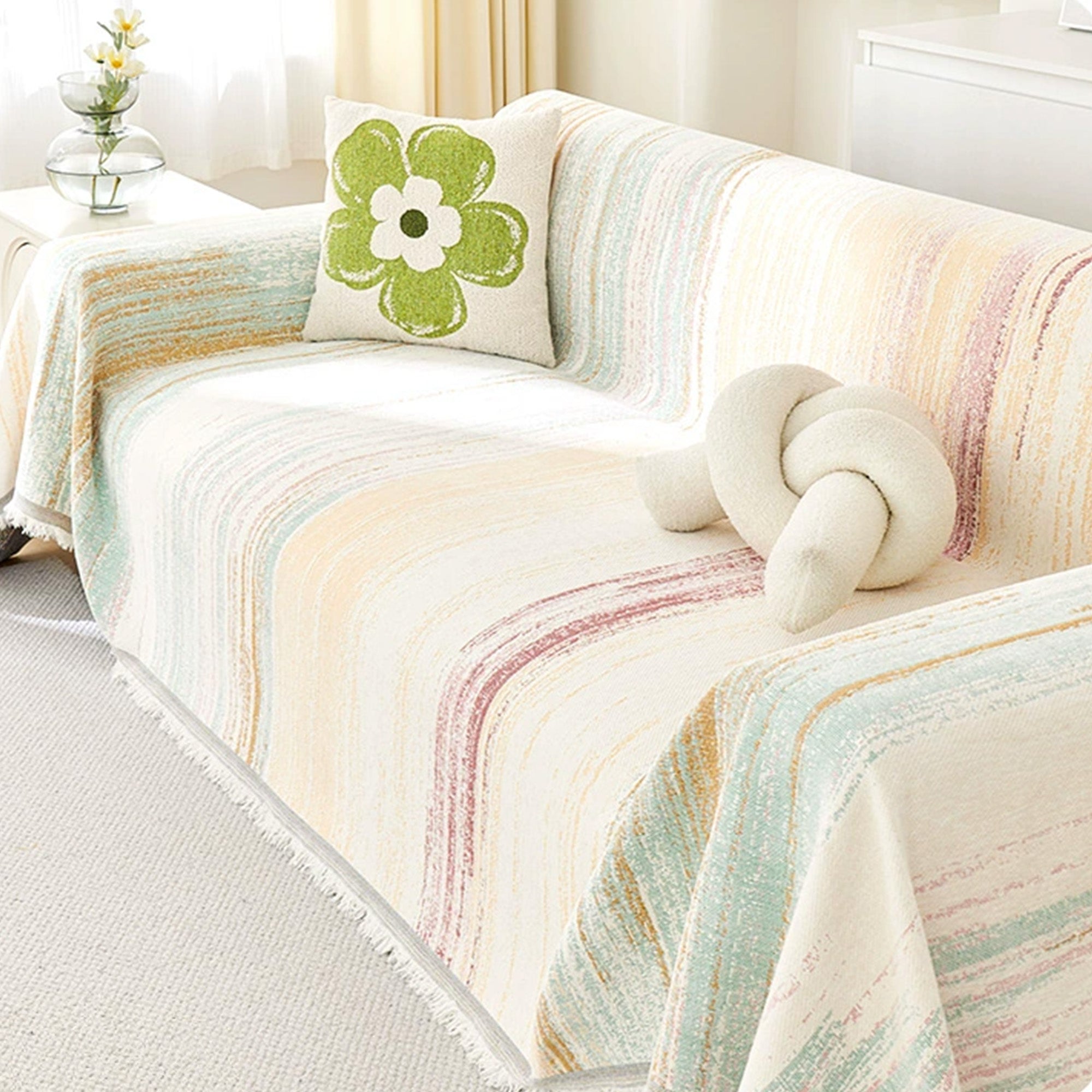 Inspired by the gentle movement of waves and watercolor brushstrokes, the Ripple Soft Chenille Sofa Cover brings a serene and effortless beauty to your living space. Crafted from ultra-soft chenille yarns, it features a flowing stripe pattern that blends creamy neutrals with soft pops of color — like nature painted in motion. Its delicate fringe adds a relaxed, cozy finish that complements minimalist, Nordic, or Japandi interiors.